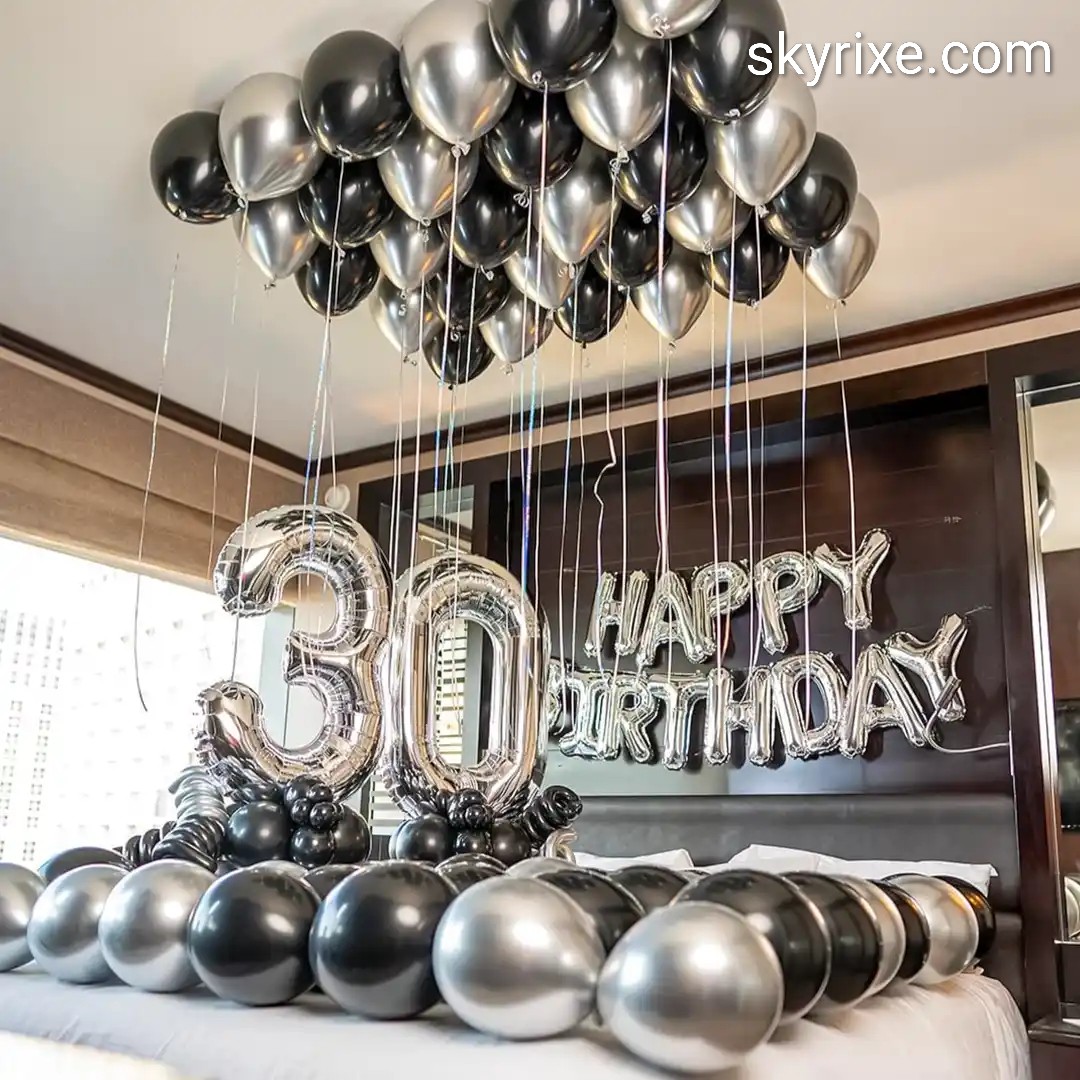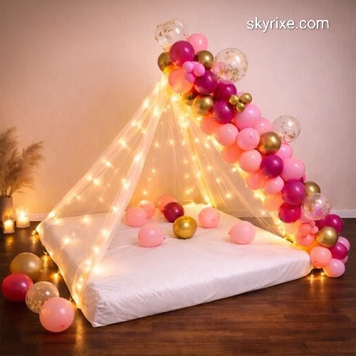 Romantic Black and Gold Birthday Surprise Room Decoration with Canopy Net