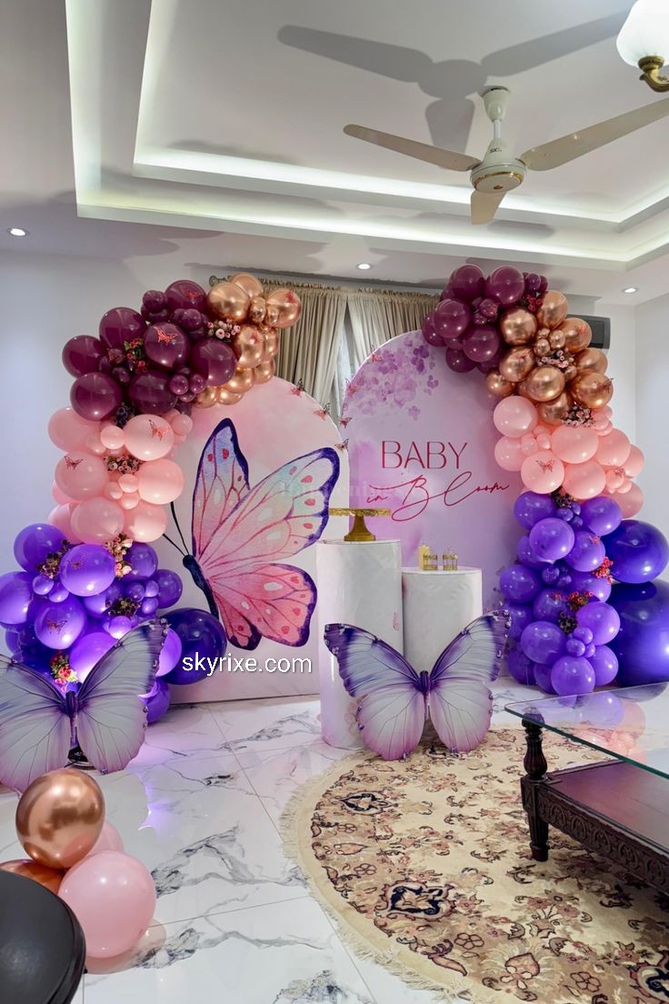 Pink Butterfly Birthday Decoration with Gold Balloon Arch