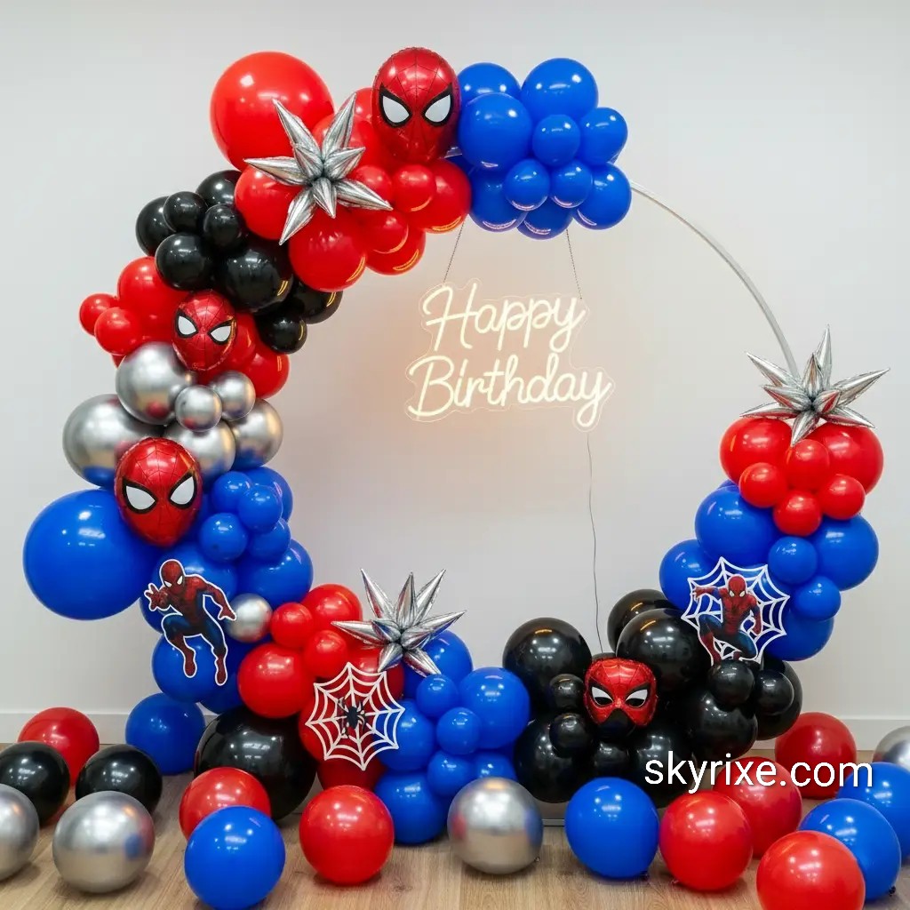 A mix of latex balloons in red, blue, and black, often with metallic or chrome finishes, is commonly used for Spiderman theme decorations.