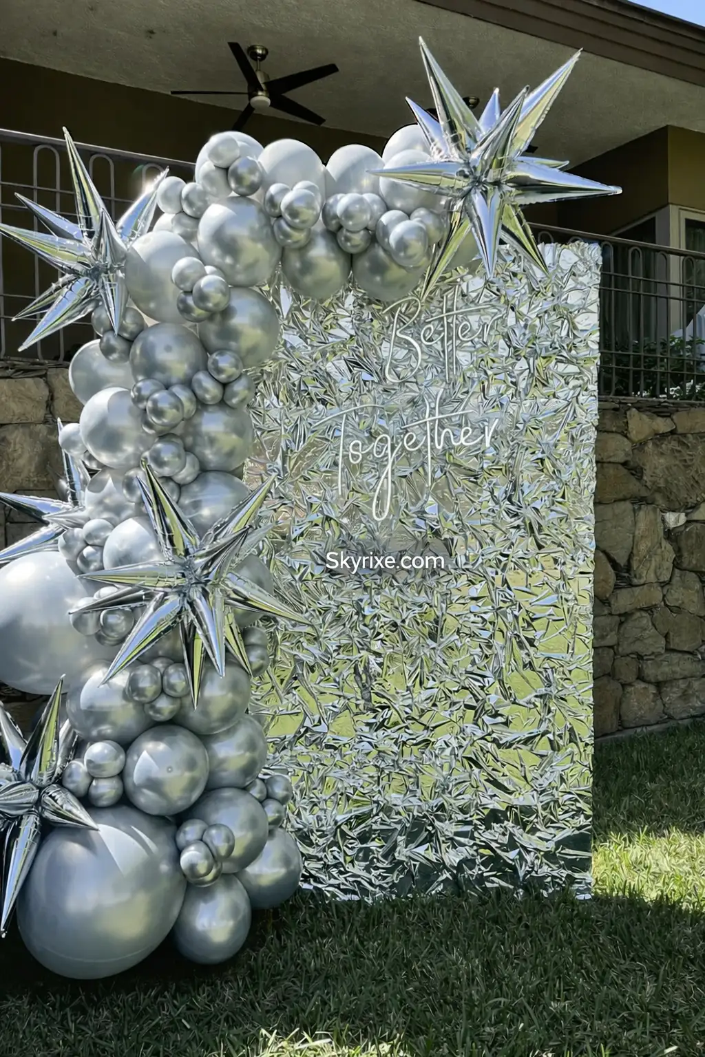 Silver Starburst Balloon Arch with Metallic Shimmer Backdrop