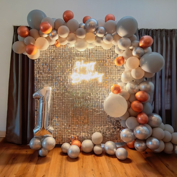 Make your baby’s first birthday celebration extra special with a stylish and luxurious decoration setup. The elegant shimmer wall combined with soft-toned balloons creates a warm and sophisticated party atmosphere.