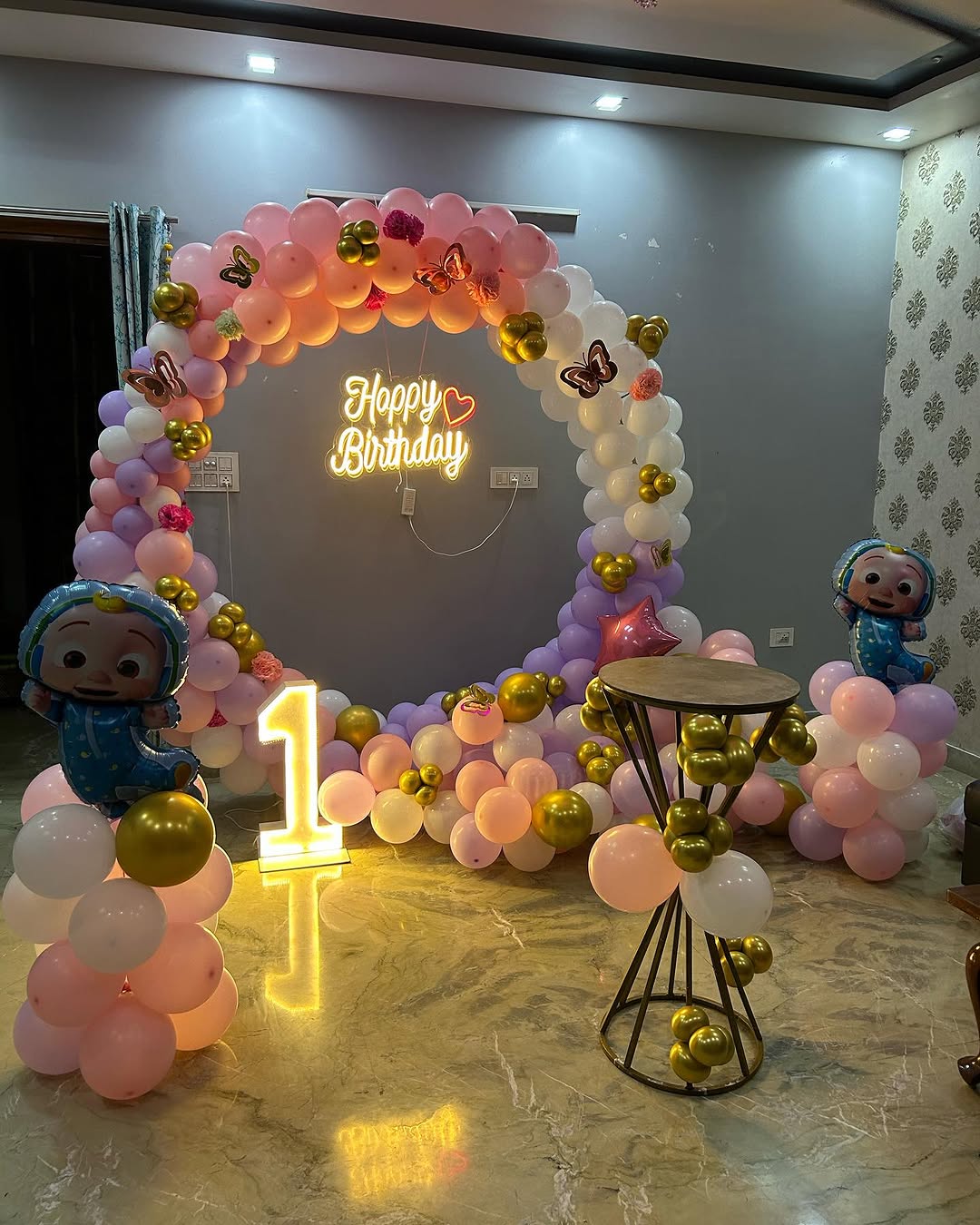 This decor setup is perfect for parents looking to create a royal, Instagram-worthy celebration for their baby's first birthday. The metallic colors and baby-themed accents deliver a joyful, vibrant environment that delights both kids and guests. It sets the perfect photo zone for birthday pictur...