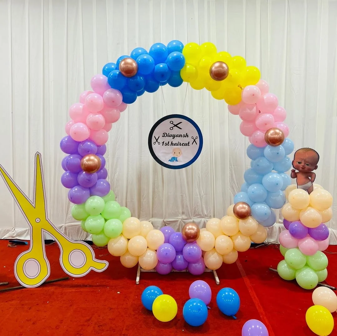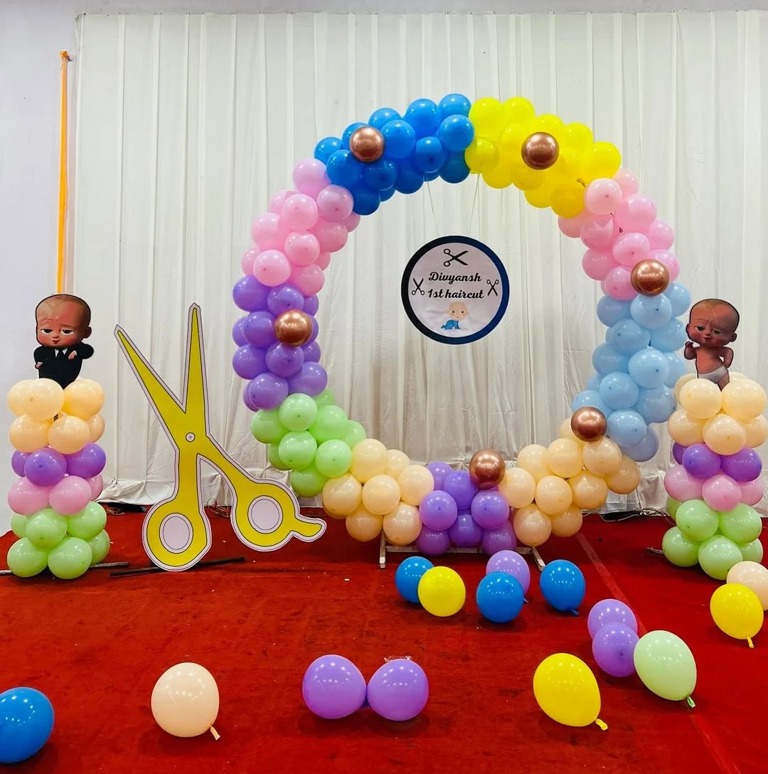 This colorful and creative balloon ring decoration is specially designed for celebrating a child's first haircut ceremony. The rainbow-inspired balloon arrangement adds a fun and cheerful vibe, while the customized name board makes the event more personal. The giant scissor prop symbolizes the ha...