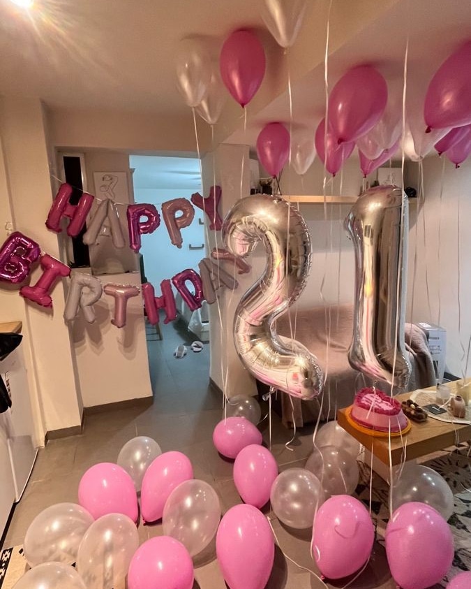✯✯This sophisticated 21st birthday decoration features a chic blend of pink, silver, and transparent balloons. The large silver "21" foil balloons serve as the focal point, while the "Happy Birthday" letter balloons add a celebratory touch. Floating ceiling balloons and scattered floor balloons c...