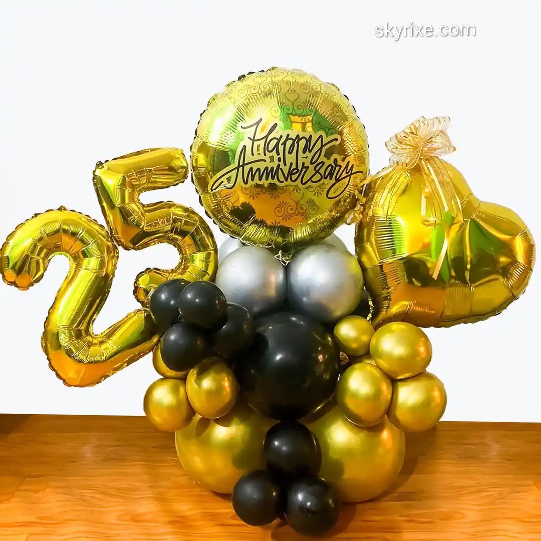 Imagine presenting a gleaming gold-themed balloon arrangement showcasing the milestone “25” alongside a heartfelt anniversary message — a beautiful symbol of love, memories, and commitment.