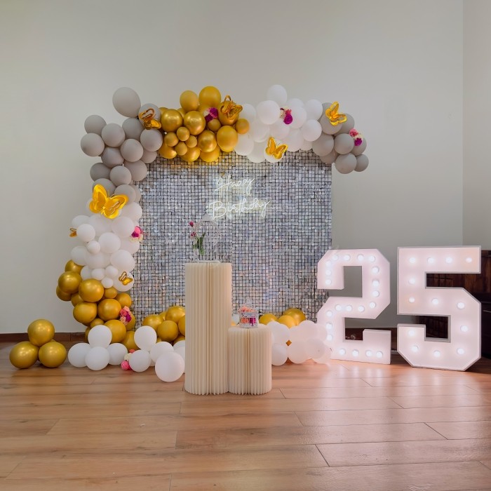 Make your 25th birthday celebration truly memorable with a stylish and Instagram-worthy decoration setup. The combination of shimmering silver, elegant white balloons, and luxurious gold accents creates a sophisticated party atmosphere.