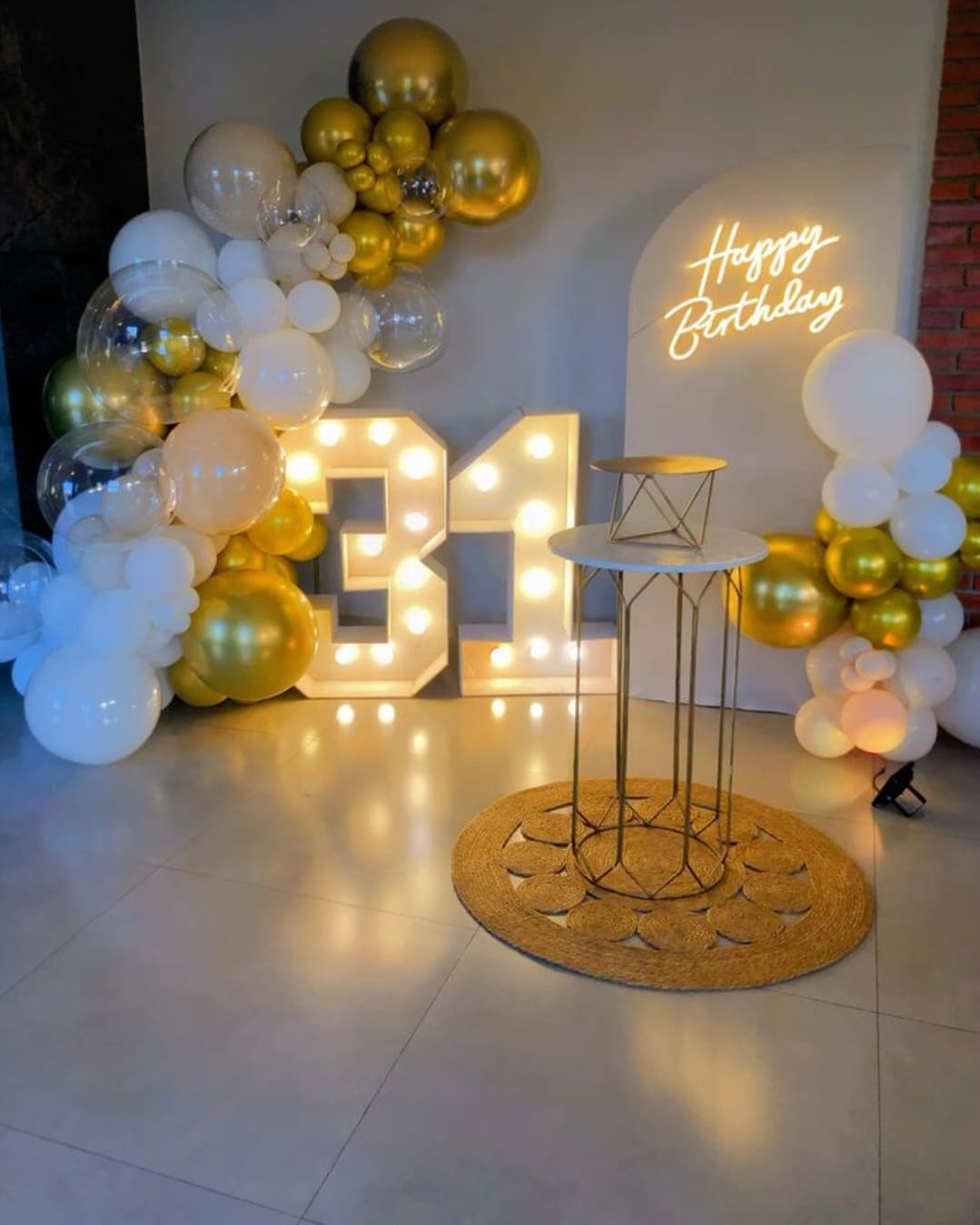 Create a sophisticated celebration with the Luxury White & Gold 31st Birthday LED Backdrop Decoration, designed for a modern and elegant party experience. This setup features a beautifully styled balloon arrangement in white and metallic gold tones, complemented by transparent balloons for a ...