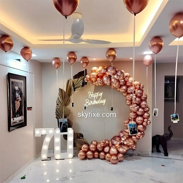 Create a premium birthday celebration space with this elegant rose-gold themed décor. Featuring a designer circular ring frame styled with metallic chrome balloons, warm LED “Happy Birthday” neon signage, suspended photo helium balloons, and illuminated marquee age numbers, this setup delivers a ...