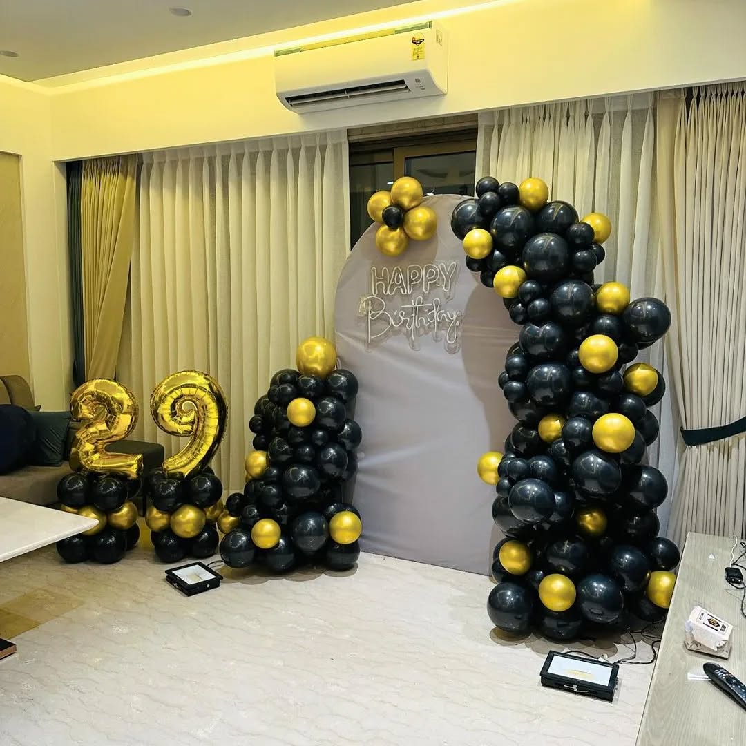 This luxurious and stylish birthday setup is perfect for indoor celebrations. It features: