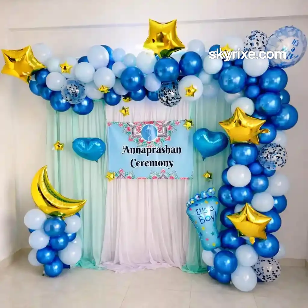 Celebrate your baby’s first rice ceremony in style with this eye-catching Royal Blue & Gold Annaprashan Decoration Setup. Designed with a rich combination of blue, white, and golden balloons, this décor creates a festive yet elegant ambiance.