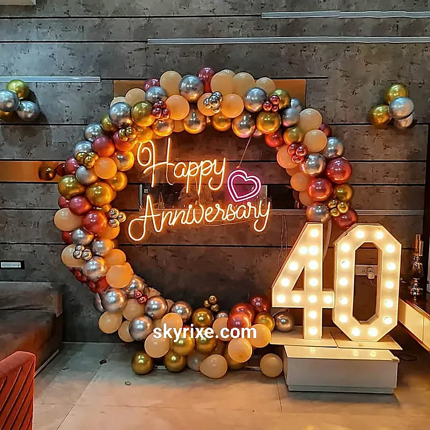 Celebrate four decades of love and togetherness with our luxurious Golden Glow 40th Anniversary Ring Setup. This elegant décor features a grand circular balloon ring designed in premium metallic gold, silver, champagne, and rose gold shades. The setup is highlighted with a warm L...