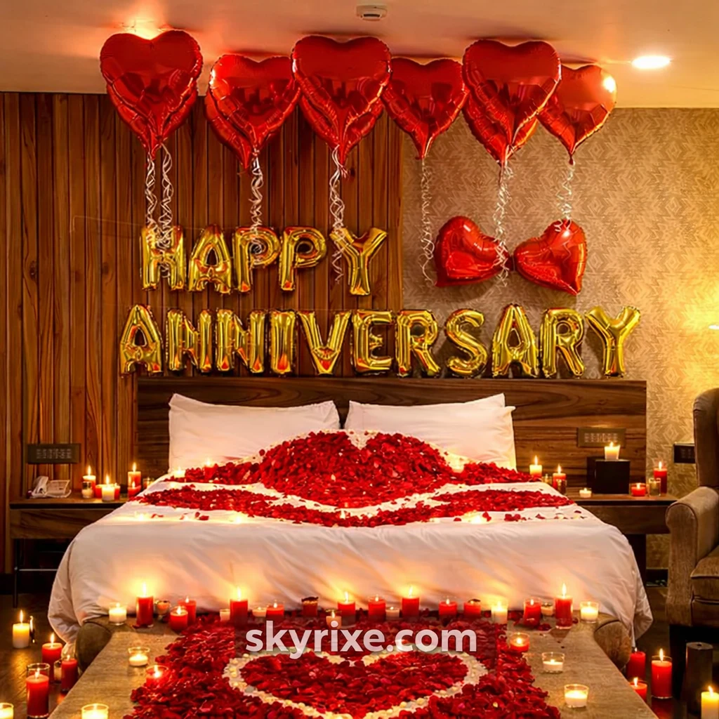 Create a magical and romantic atmosphere with this Romantic Anniversary Room Decoration Setup. Designed with heart-shaped foil balloons, elegant “Happy Anniversary” letter balloons, rose petals, and warm candle lighting, this setup is perfect for surprising your partner.