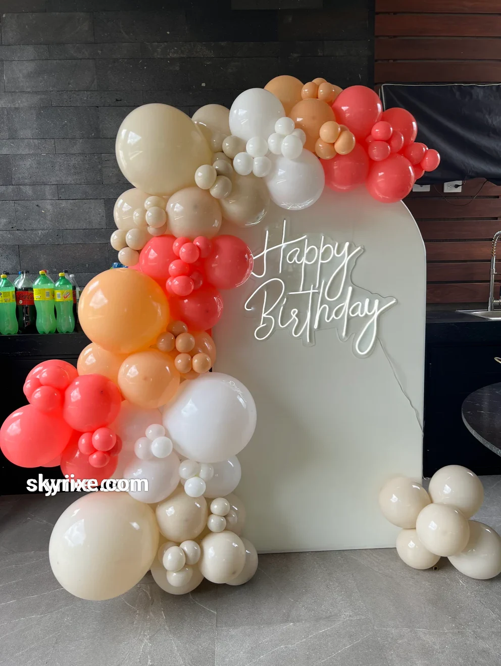 Add soft sophistication to your celebration with our Peach Blush Elegant Birthday Backdrop. This design features a premium off-white arch panel with glowing neon “Happy Birthday” signage and an organic balloon garland in peach, coral, nude, and ivory tones. Perfect for girls, women, and classy bi...