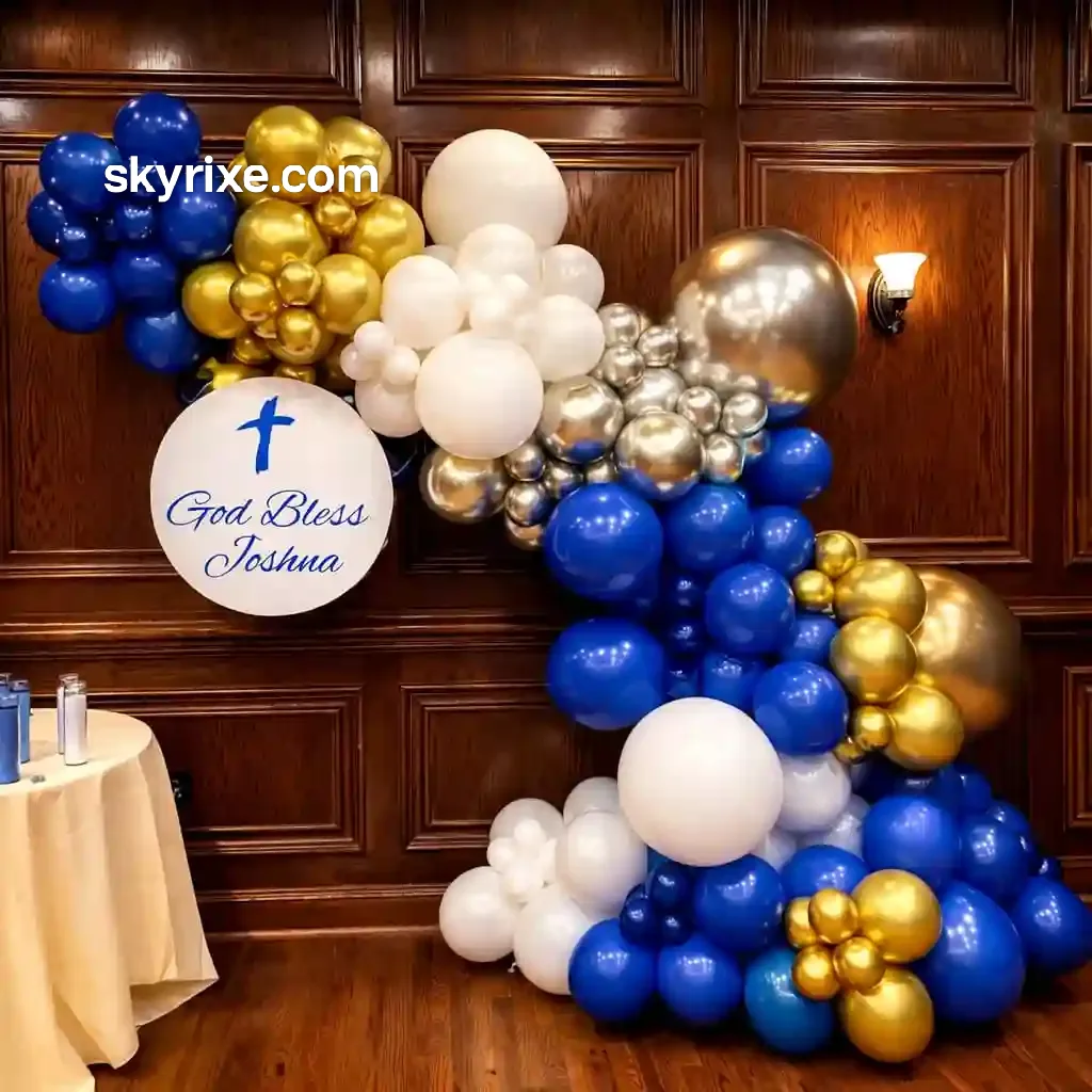 Celebrate your child’s special day with grace and blessings using this Baptism / Christening Theme Balloon Decoration. Designed with a rich combination of royal blue, white, and gold balloons, this setup creates a peaceful yet premium ambiance.