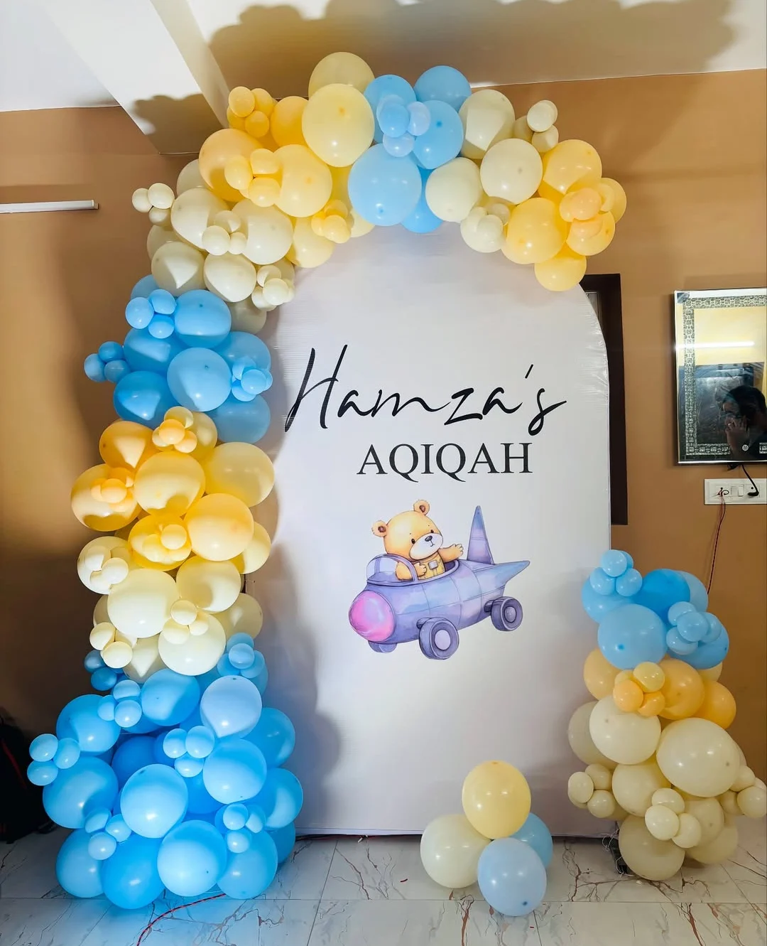 This charming design is specially crafted for Aqiqah ceremonies or baby welcome events. It features a customized white backdrop with a printed name and a cute cartoon bear in an airplane, surrounded by a balloon arch in soft pastel shades of blue, yellow, and cream. A perfect setting for a warm a...