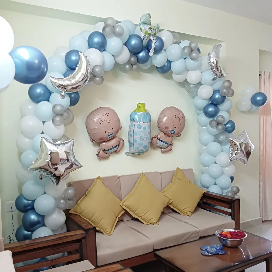 The Baby Boy Welcome Home Balloon Decor is a charming and cozy balloon setup designed to celebrate the arrival of a newborn baby boy. The decoration has a pastel blue and silver color palette with white and gray accents, creating a gentle and elegant ambiance. It's perfect for home settings, espe...