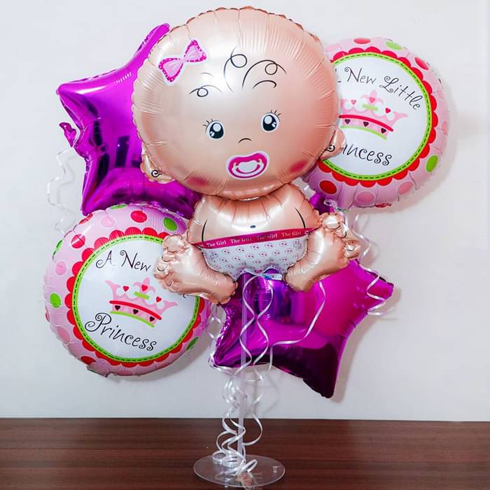 This adorable baby girl balloon arrangement is designed for celebrating the arrival of a newborn baby girl. It features a large baby-shaped foil balloon as the centerpiece, surrounded by pink and purple star and round foil balloons with a royal princess theme. The elegant "A New Little Princess" ...