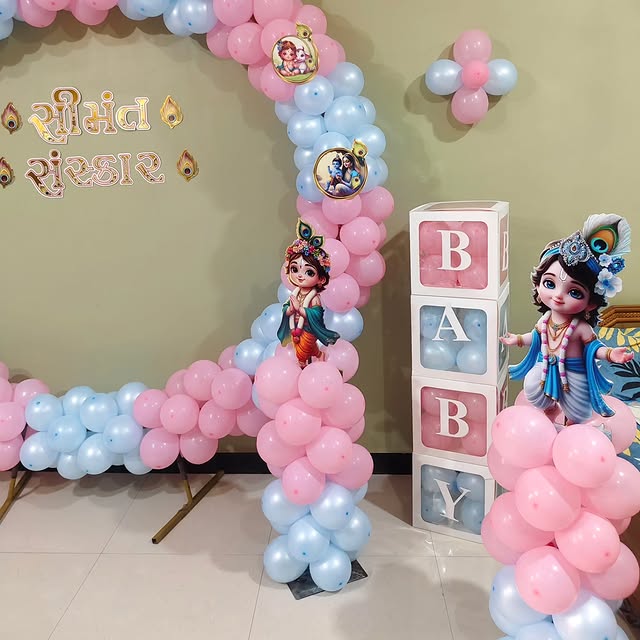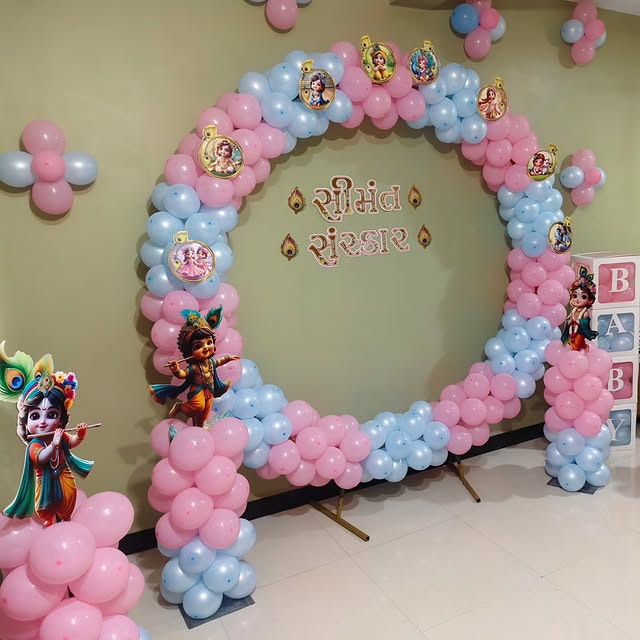 This Baby Krishna Theme decoration is perfect for a Seemantham (Indian baby shower) or a naming ceremony. It features a pastel blue and pink balloon arch, symbolizing joy and celebration for the arrival of a baby. The central arch is adorned with Krishna cutouts and themed frames with images of B...