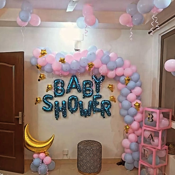 This charming baby shower decoration is perfect for creating a magical and cozy celebration for the mom-to-be. Featuring a half-arch balloon garland with pastel pink and blue balloons, accented by golden star balloons, this setup is a wonderful choice for both baby boy and baby girl themes.