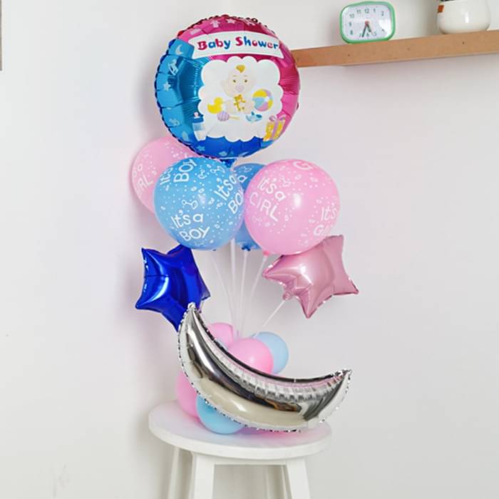 This adorable baby shower balloon bouquet is a perfect table decoration for a gender reveal or baby shower celebration. The mix of blue and pink balloons symbolizes "It's a Boy" & "It's a Girl," making it ideal for surprising guests. The silver moon foil balloon and star-shaped balloons add a...