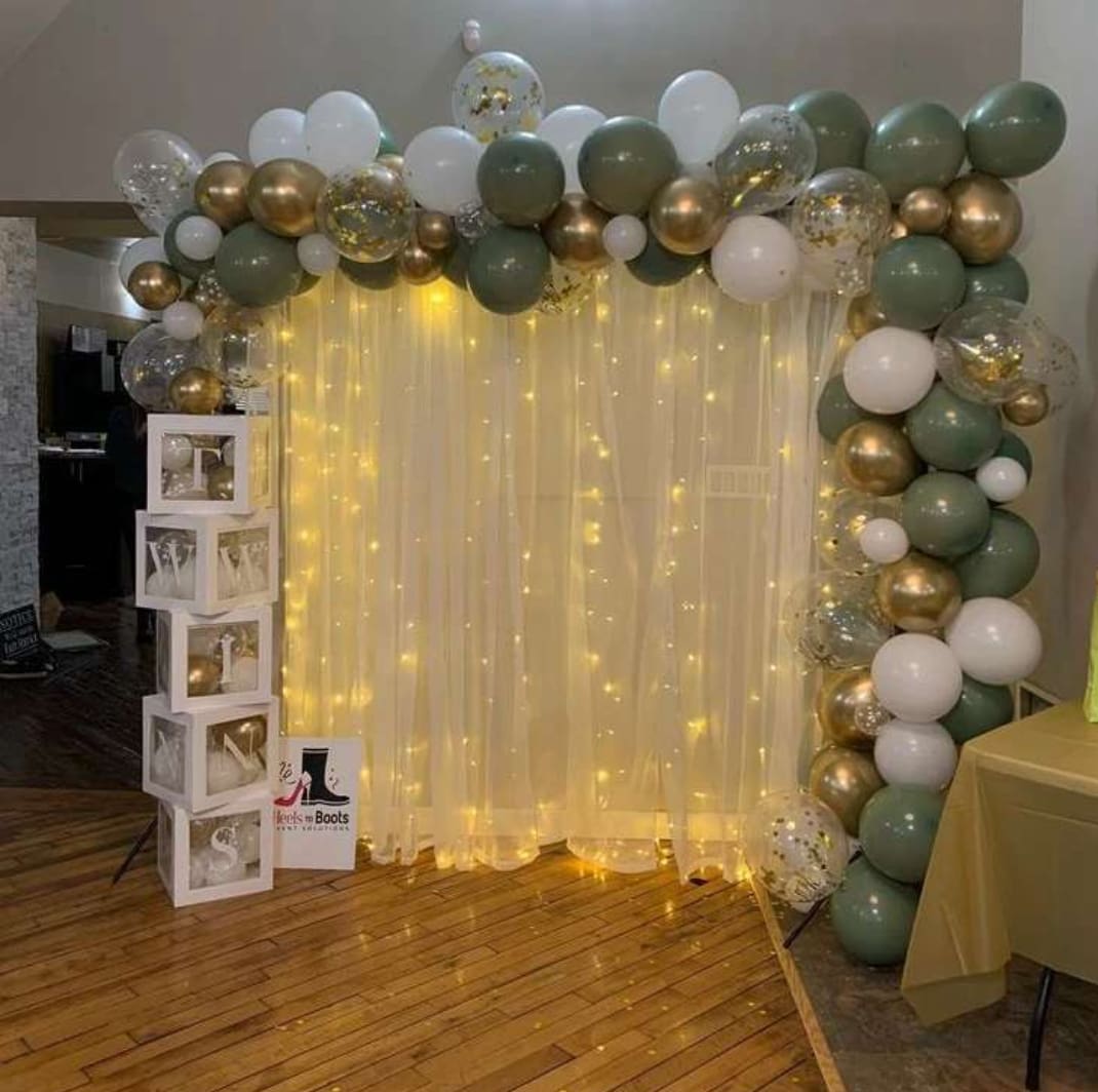Bring elegance and warmth to your celebration with this premium Olive Luxe Glow Decoration Setup, designed with a sophisticated blend of sage green, white, and metallic gold balloons. This setup features a beautifully styled balloon arch frame paired with a soft sheer curtain backdrop illuminated...