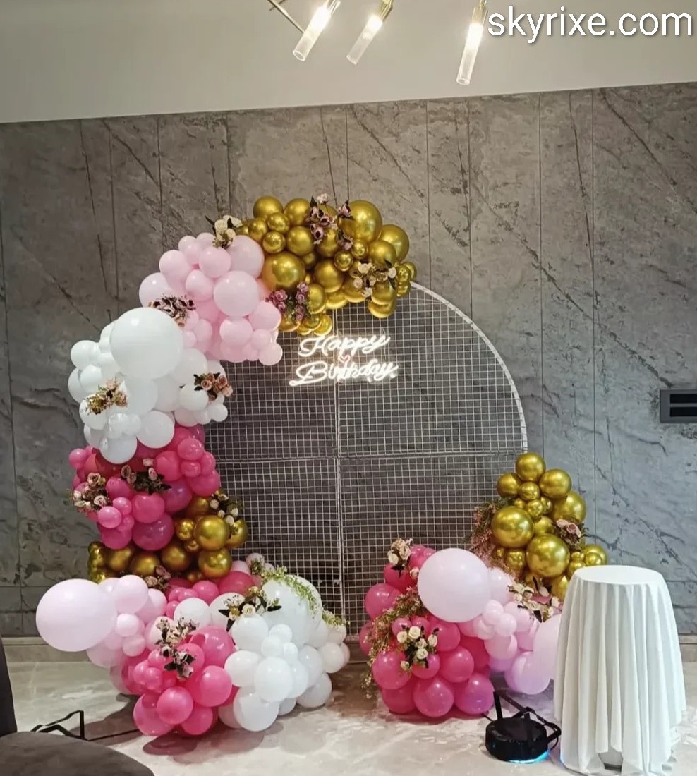 This hoop décor creates a soft, luxurious celebration space that feels both intimate and photogenic. The pastel pink palette evokes warmth and joy, while gold chrome balloons introduce a festive premium touch. Guests naturally gather around the hoop for photos, and the neon glow adds depth and ev...