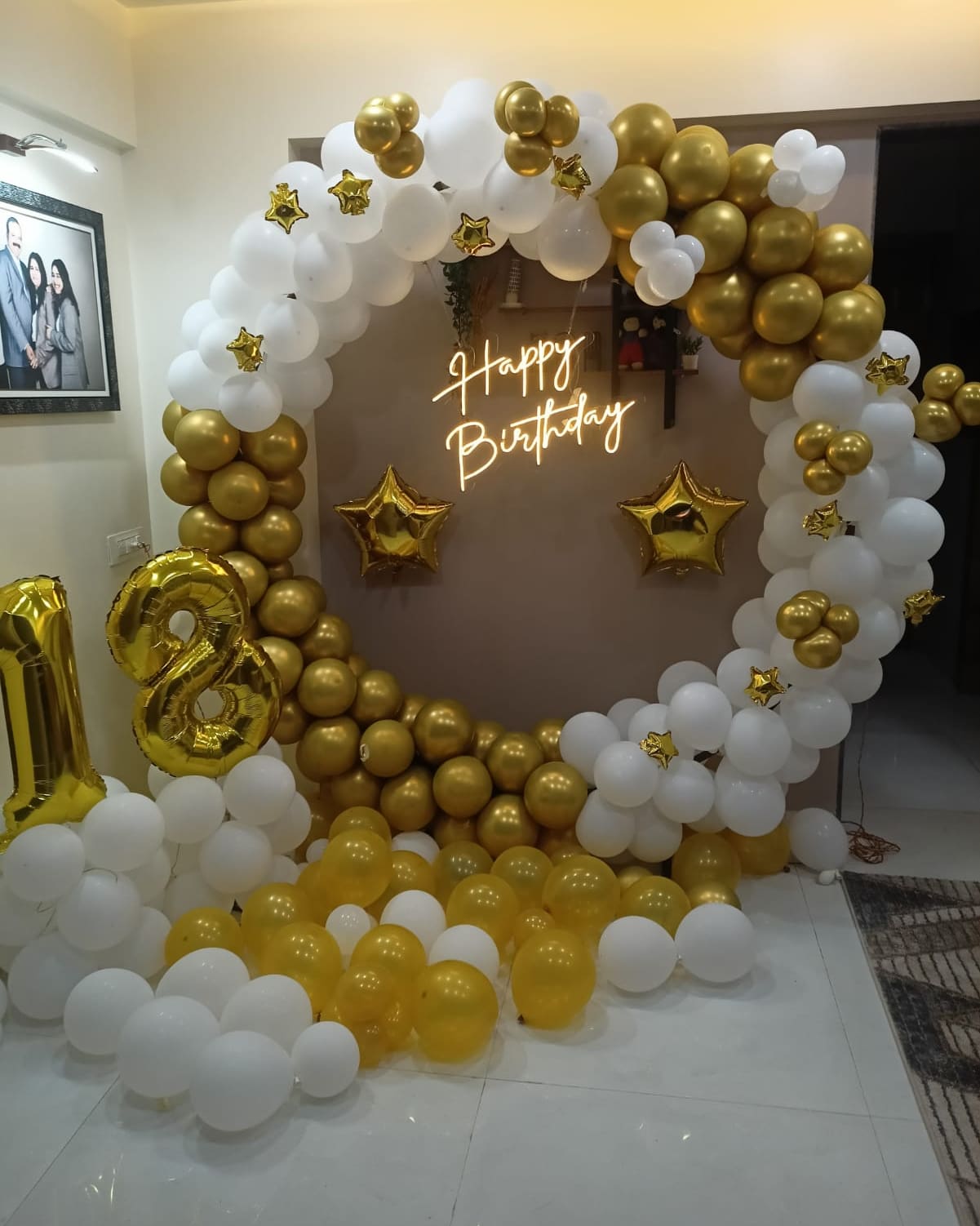 Make your celebration look premium and unforgettable with this stunning Gold & White Circular Balloon Ring Birthday Decoration, designed to create a luxurious and modern party backdrop. This setup features a full circular balloon ring in metallic gold and white tones paired with a glowing “Ha...