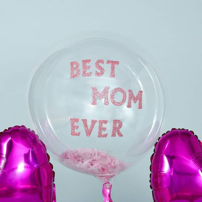 ...✅1x Large Transparent Bubble Balloon (Printed with "Best Mom Ever" in pink glitter text and filled with soft pink feathers)