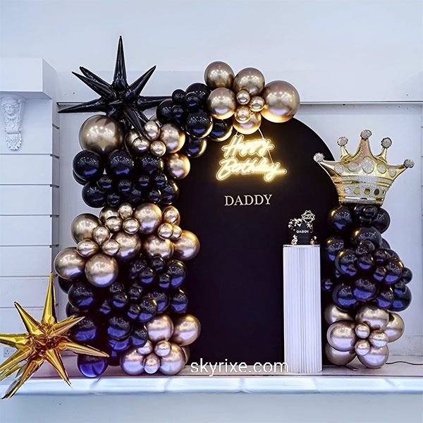 This decoration creates a regal and masculine celebration environment designed to honor fathers and milestone male birthdays. The black backdrop establishes a strong, elegant base, while gold metallic balloons introduce shine and luxury. The sculpted organic garlands flow along the arch shape, cr...