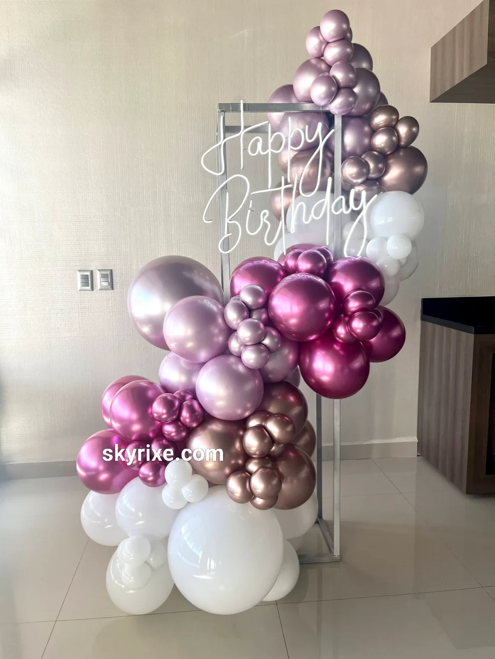 Celebrate in style with our Rose Chrome Luxe Birthday Frame Backdrop, a sophisticated balloon arrangement designed around a sleek metallic frame and glowing “Happy Birthday” neon sign. Featuring a rich palette of rose pink chrome, mauve, metallic champagne, and pearl white balloo...