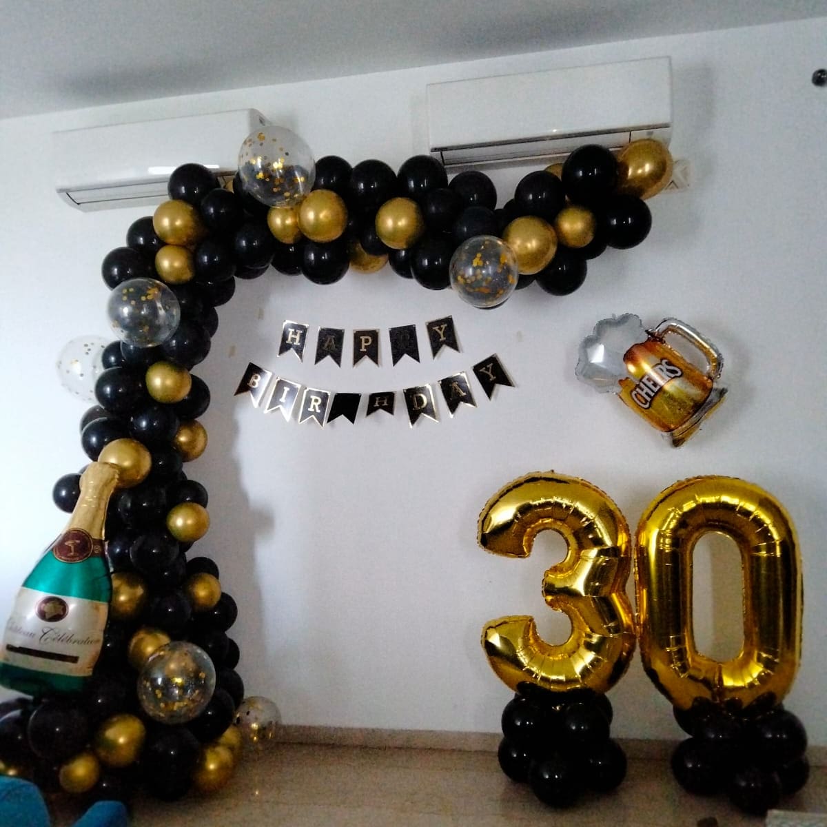 Celebrate an unforgettable milestone with the Black Gold 30th Birthday Celebration Balloon Decoration, a stylish decoration setup designed for milestone birthday parties and surprise celebrations. Featuring an elegant black and gold balloon arch paired with large gold number balloons, this decora...