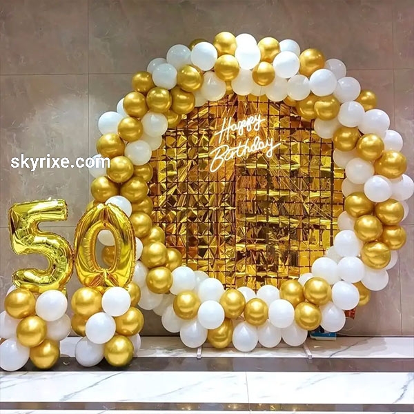 Celebrate a golden milestone with this radiant Gold & White 50th Birthday Round Backdrop Decoration, designed to create a luxurious and eye-catching celebration focal point. The setup features a full circular balloon ring in metallic gold and white tones surrounding a shimmering gold sequin b...