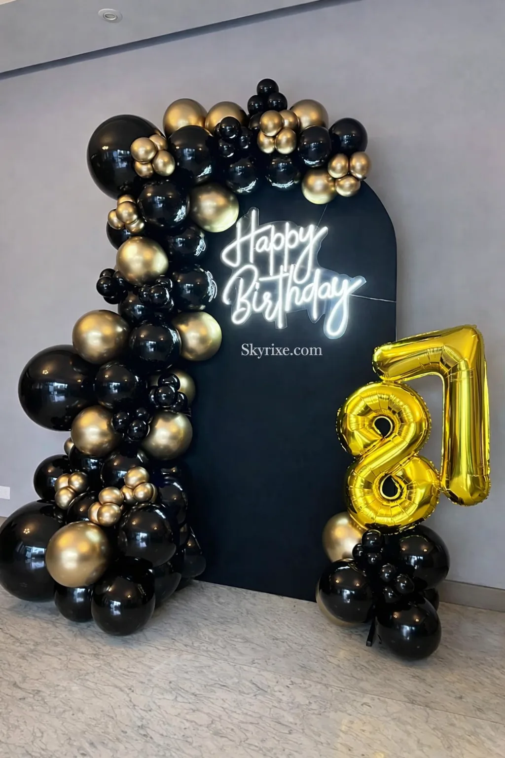 Celebrate in bold luxury with our Black & Gold Luxe Birthday Arch décor. This premium setup features a sleek black arched backdrop adorned with an organic balloon garland in glossy black and metallic gold tones. A radiant “Happy Birthday” LED neon sign creates a stunning focal point, while ov...