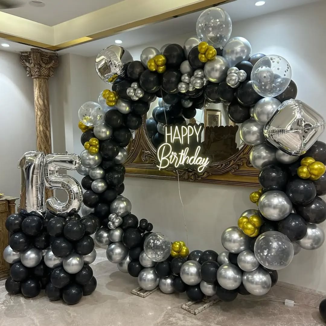 This luxurious black, silver, and gold balloon arch is designed for sophisticated birthday celebrations, particularly milestone birthdays like 15th, 18th, 21st, 30th, and beyond. The elegant circular design, highlighted with a neon "Happy Birthday" sign, gives a classy, modern, and premium feel t...