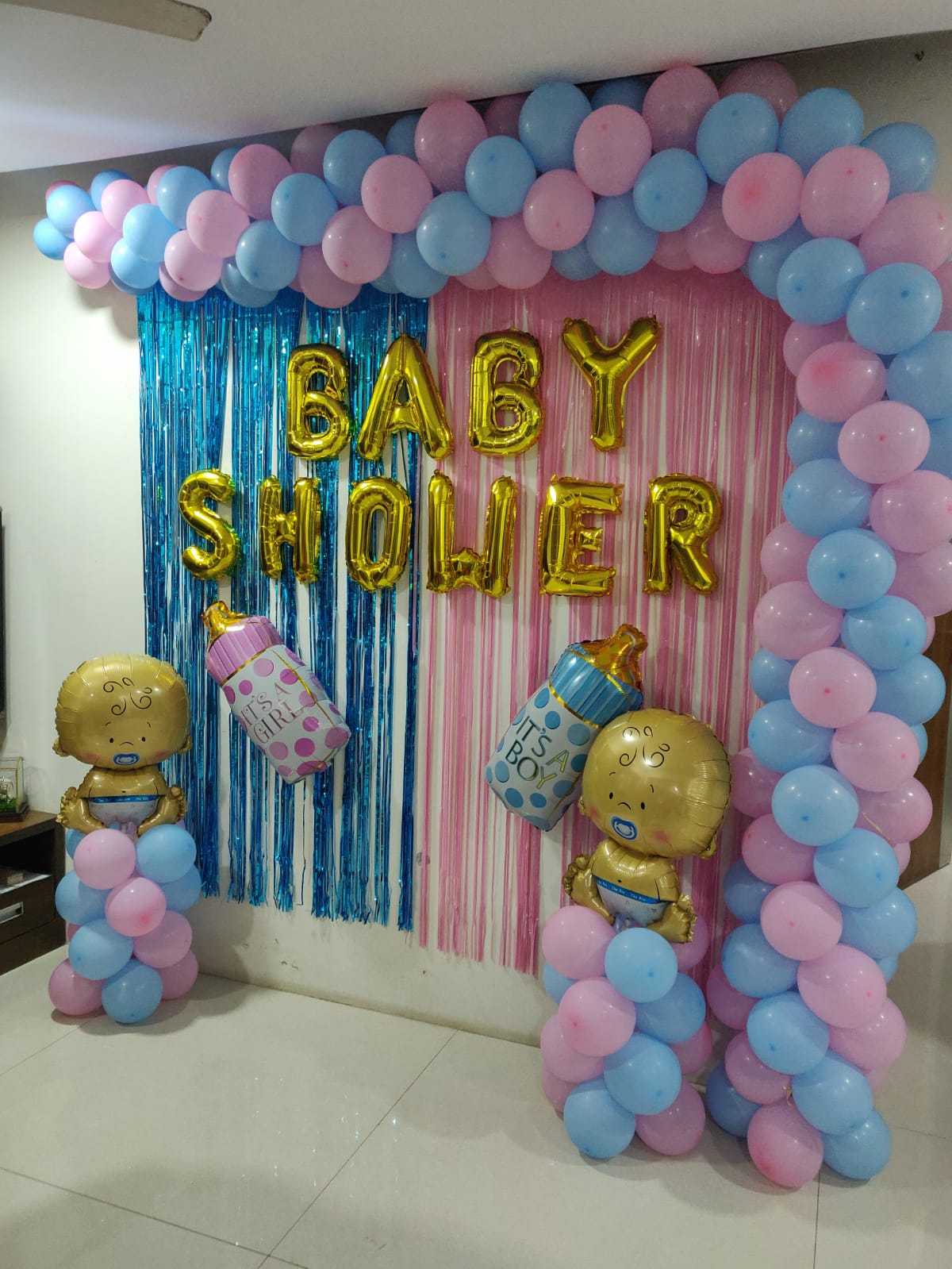 This adorable baby shower decor setup features a pink and blue balloon arch, symbolizing the joy of welcoming a baby boy or girl. The combination of gold foil letter balloons spelling "BABY SHOWER" and a shimmering blue-and-pink fringe backdrop makes this setup perfect for capturing memorable mom...