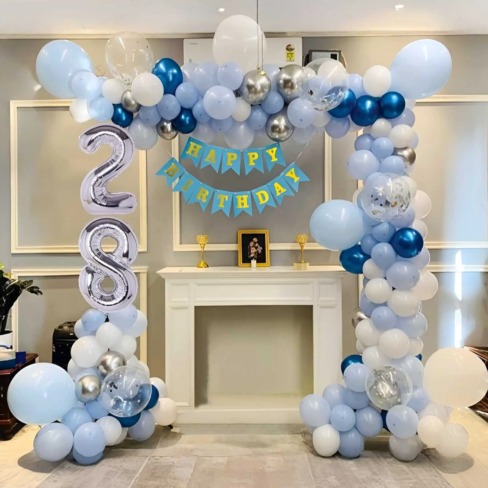 Celebrate a stylish birthday with this elegant balloon arch setup in cool tones of baby blue, silver, navy, and white. Framing your party space beautifully, this decor features a bold numeric foil balloon (for age), a classic “Happy Birthday” bunting, and a sophisticated blend of glossy and matte...