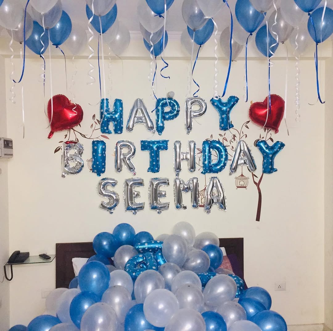 ✯✯This classy and cozy birthday decoration features a combination of blue, silver, and white balloons with foil letter balloons spelling out "HAPPY BIRTHDAY SEEMA." The design includes a balloon ceiling setup with ribbons, a balloon bed d...