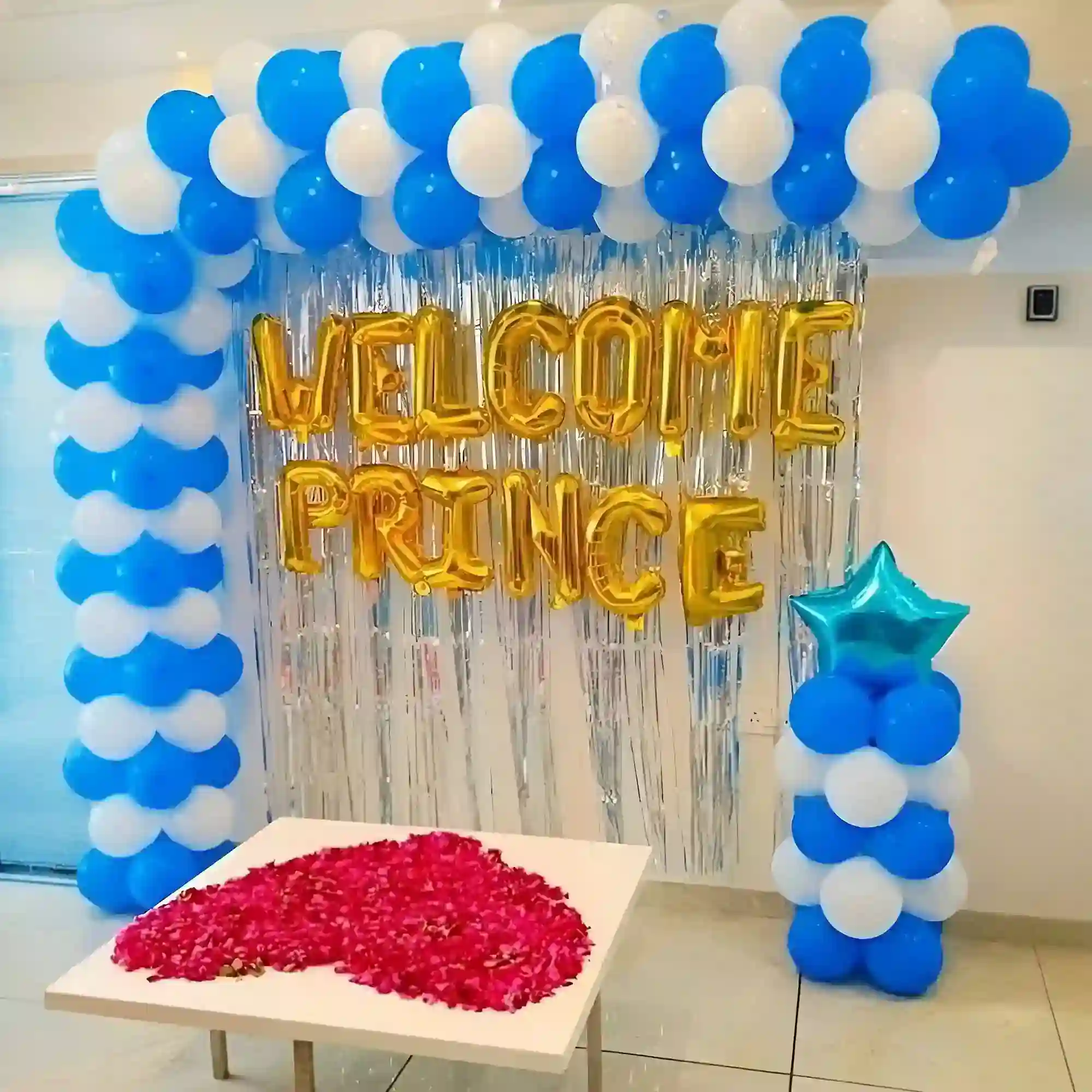 A bright and cheerful blue-themed balloon decoration designed to welcome a newborn baby boy. Featuring a structured balloon arch in white and blue, shimmering foil curtains, and golden “WELCOME PRINCE” foil letters, this setup creates a royal and loving atmosphere for a homecoming or naming cerem...
