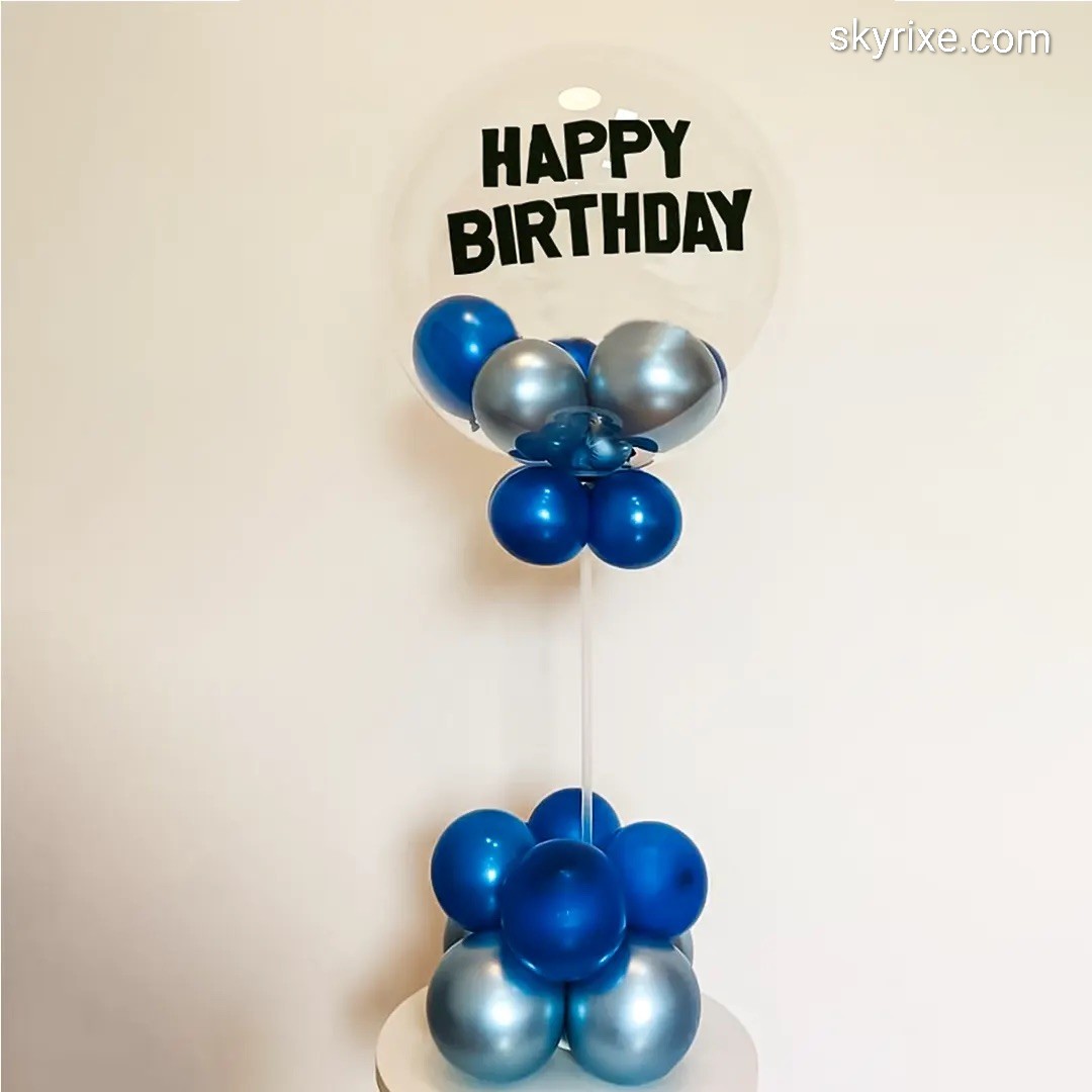 A sleek and modern birthday balloon stand featuring a transparent bubble balloon with bold “Happy Birthday” text, accented by metallic blue and silver balloon clusters. Mounted on a clean white stand base, this elegant vertical arrangement is perfect for table décor, entrance styling, or intimate...
