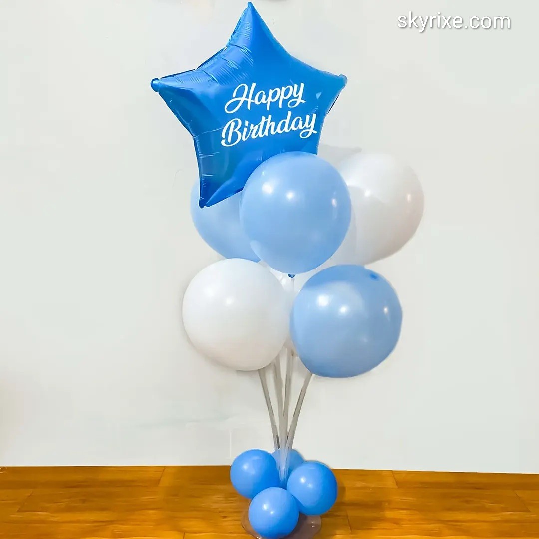 A fresh and cheerful birthday balloon bouquet featuring a glossy blue star foil balloon with “Happy Birthday” text, paired with pastel blue and white latex balloons. Arranged in a neat cluster with transparent balloon sticks and a matching balloon base, this lightweight floor or tabletop bouquet ...