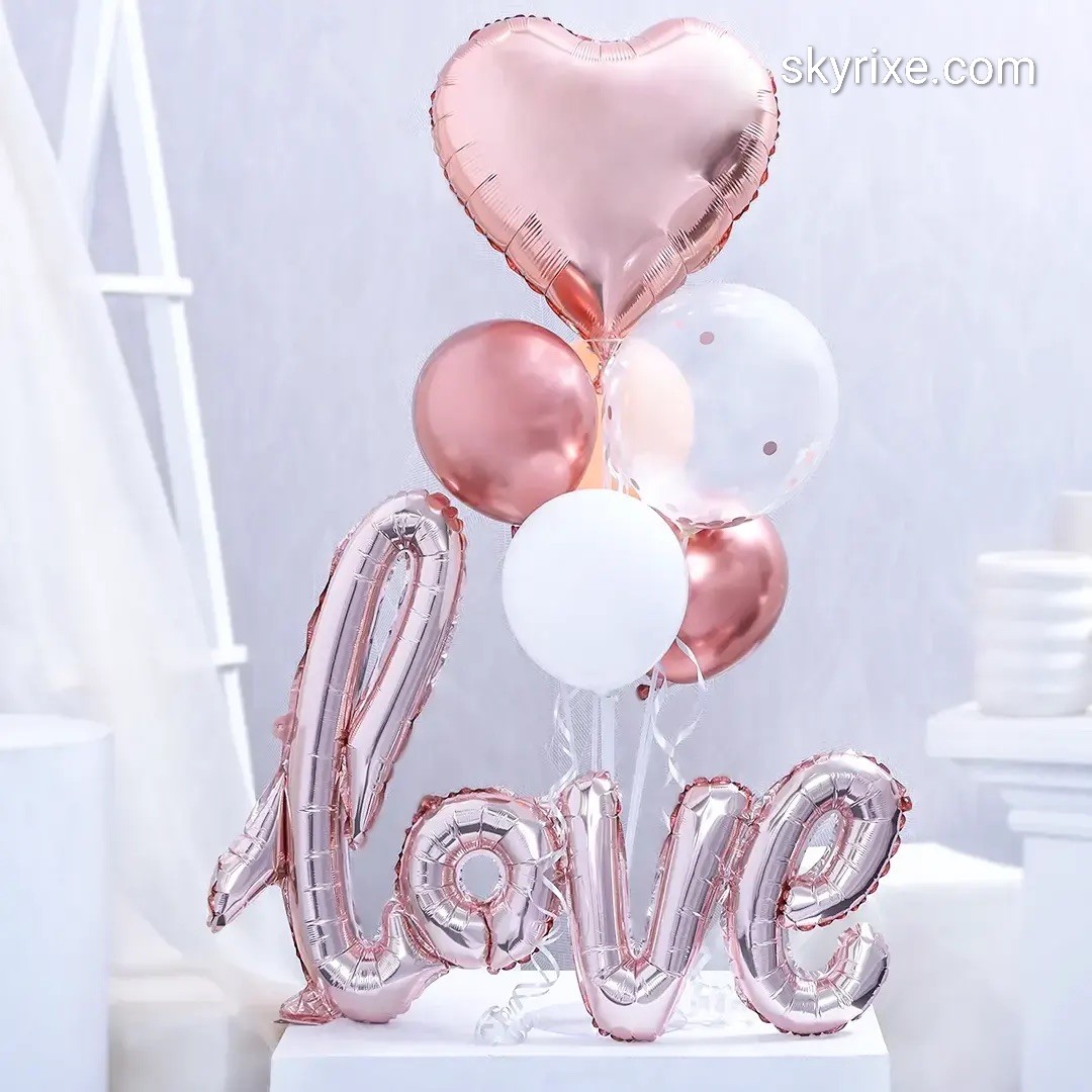 A graceful romantic balloon arrangement in elegant blush pink and white tones, featuring a premium rose-gold “love” script foil balloon topped with a matching heart balloon bouquet. Perfectly styled on a clean pedestal base, this décor adds a soft, luxurious charm to proposals, anniversaries, Val...