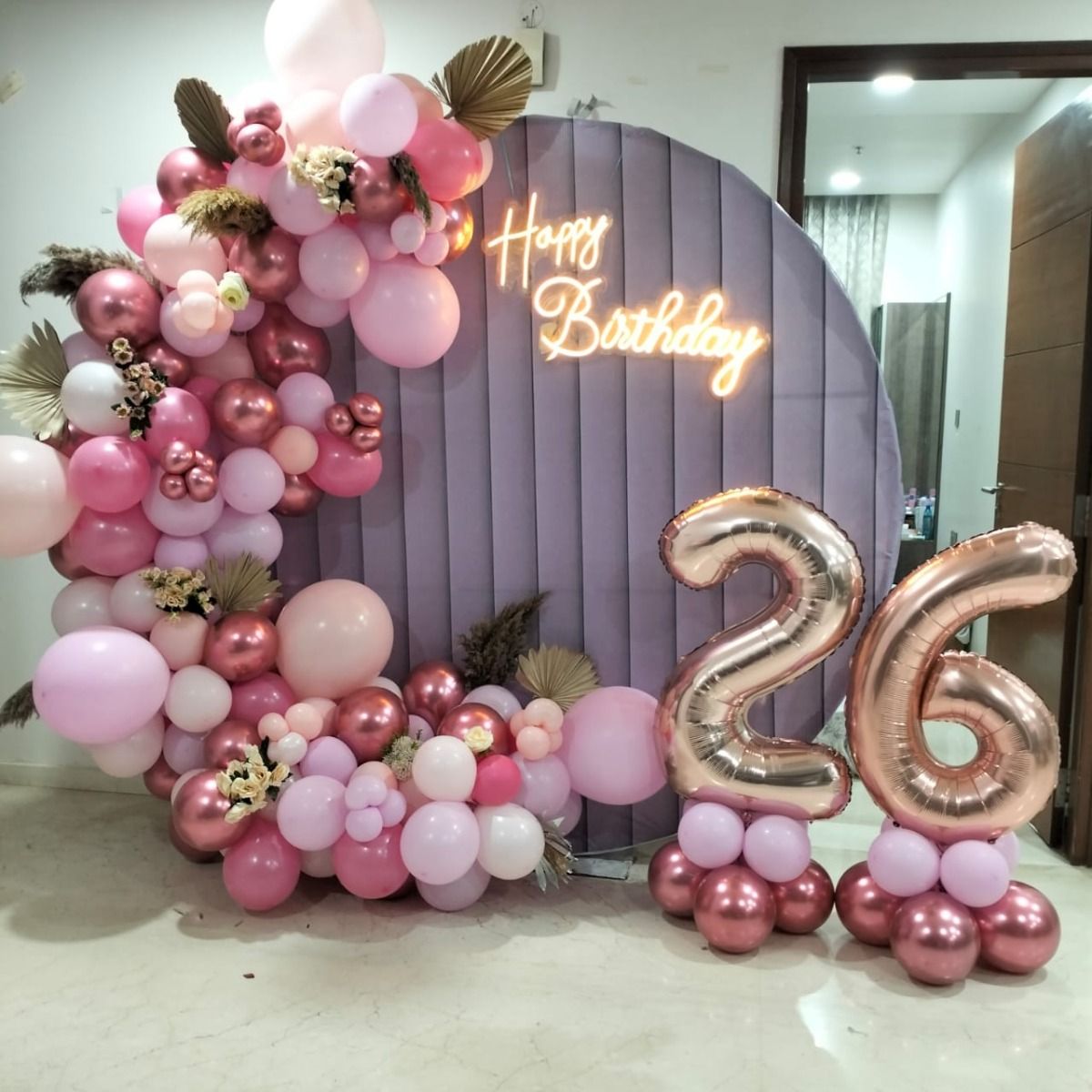 ✯✯ A luxurious and elegant birthday decoration featuring a pastel pink and rose gold color scheme. The setup includes a round lilac backdrop with a neon "Happy Birthday" sign, an organic balloon arrangement, dried floral elements, and large metallic number balloons for age representation (26...