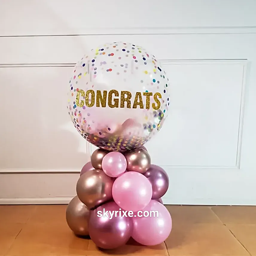 Celebrate special achievements with this elegant Congrats Bubble Balloon Decoration. Featuring a transparent bubble balloon filled with colorful confetti and bold “CONGRATS” text, paired with a premium pastel balloon base, this décor adds a classy and joyful touch to any celebration.