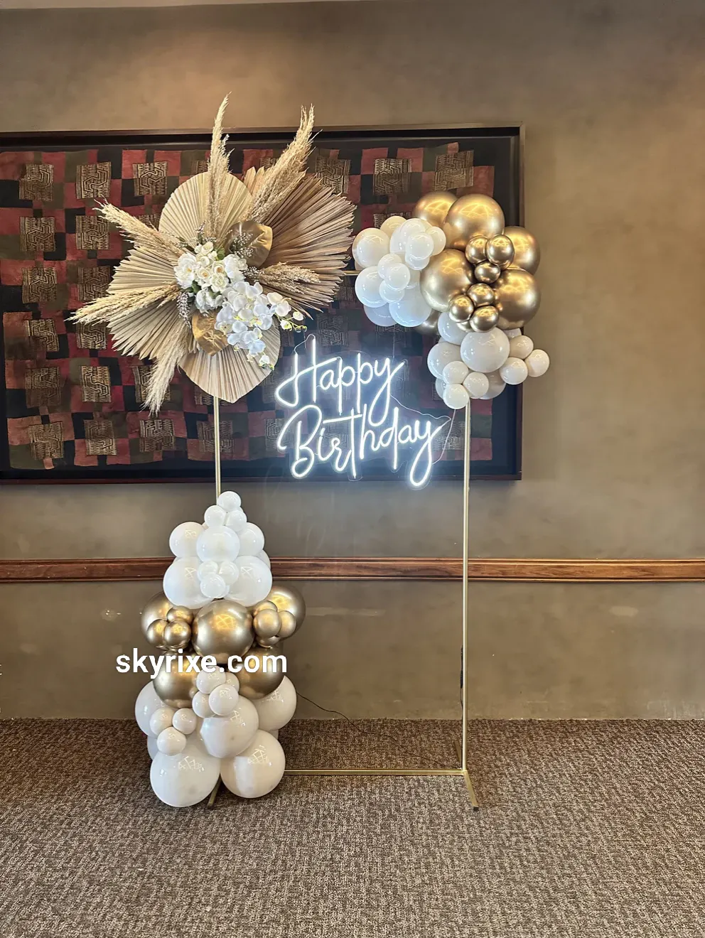 Requires approximately 4–5 ft floor width and flat surface for frame stability. Designed primarily for indoor use; outdoor setup possible in low-wind conditions only due to lightweight pampas elements. Neon-style sign needs nearby power source if lit version is selected. Installation typically takes 30–45 minutes. Pampas and dried décor are delicate—avoid touching or placing near moisture or strong airflow (fans/AC vents). Balloons are air-filled for durability and remain intact through event duration. Frame and pampas installation are reusable props; balloons are single-event décor.