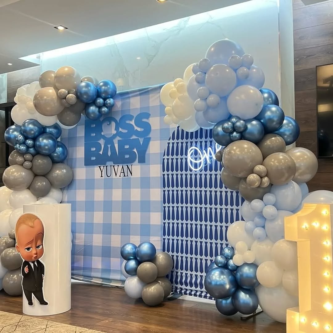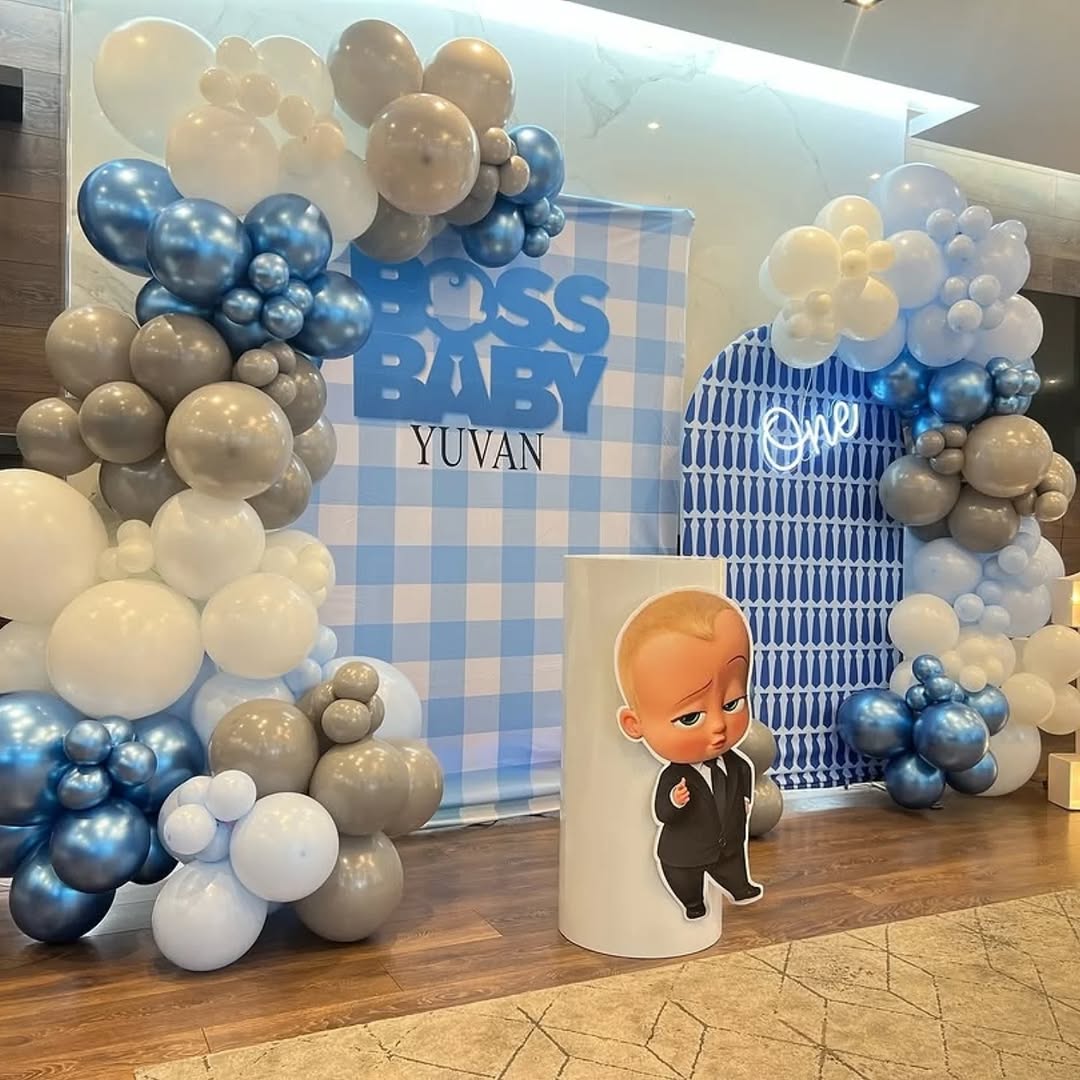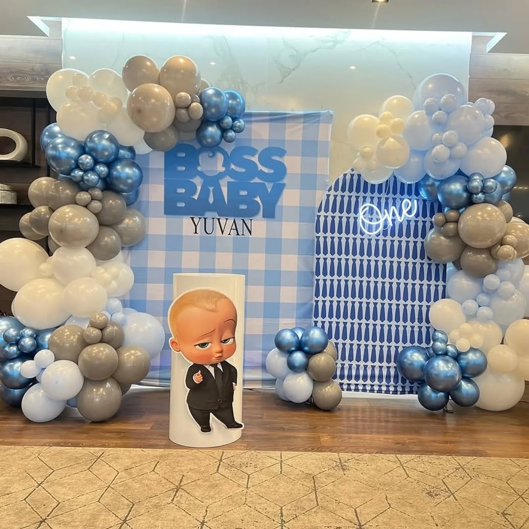 This adorable and stylish birthday setup is inspired by the popular Boss Baby theme, making it a perfect choice for a first birthday celebration. The decor features a blue gingham checkered backdrop with custom name print, an arched panel with a "One" neon sign, and a large Boss Baby cutout stand...