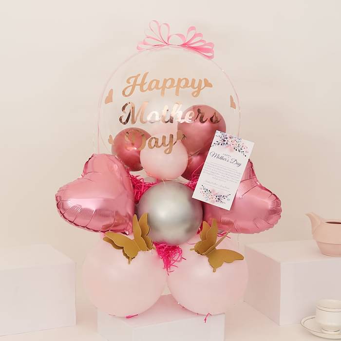 This elegant Mother's Day balloon arrangement is designed to express love and appreciation in a unique and artistic way. Featuring a clear bubble balloon with “Happy Mother’s Day” written in gold script, complemented by soft pink and metallic silver tones, this arrangement creates a warm and hear...