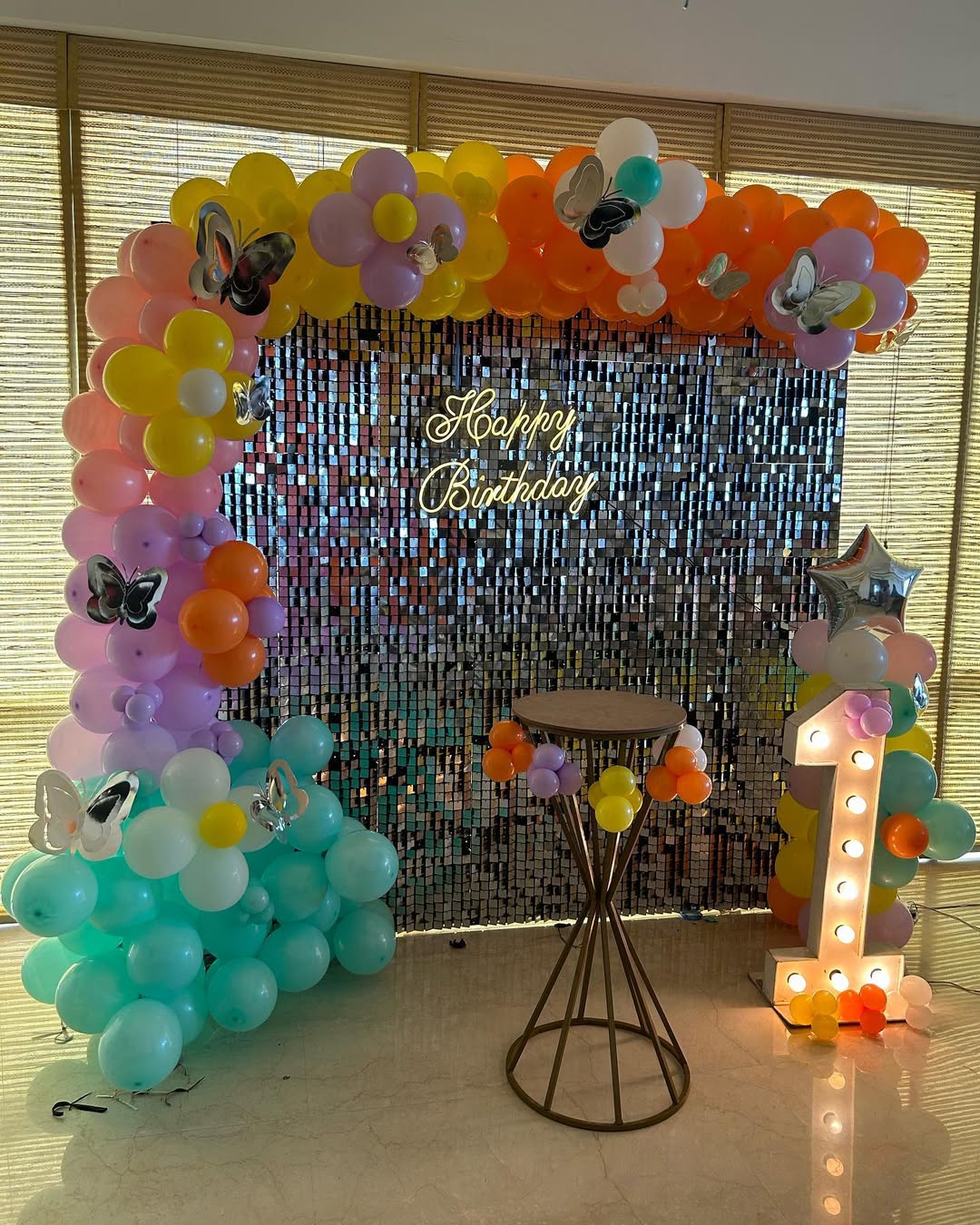 *️⃣This charming and colorful birthday backdrop features a silver sequin panel with a pastel and vibrant balloon arch. The theme is enhanced by flower-shaped balloon clusters and metallic butterfly *️⃣accents, giving it a whimsical garden feel. A glowing neon "Happy Birthday" sign adds an elegant...