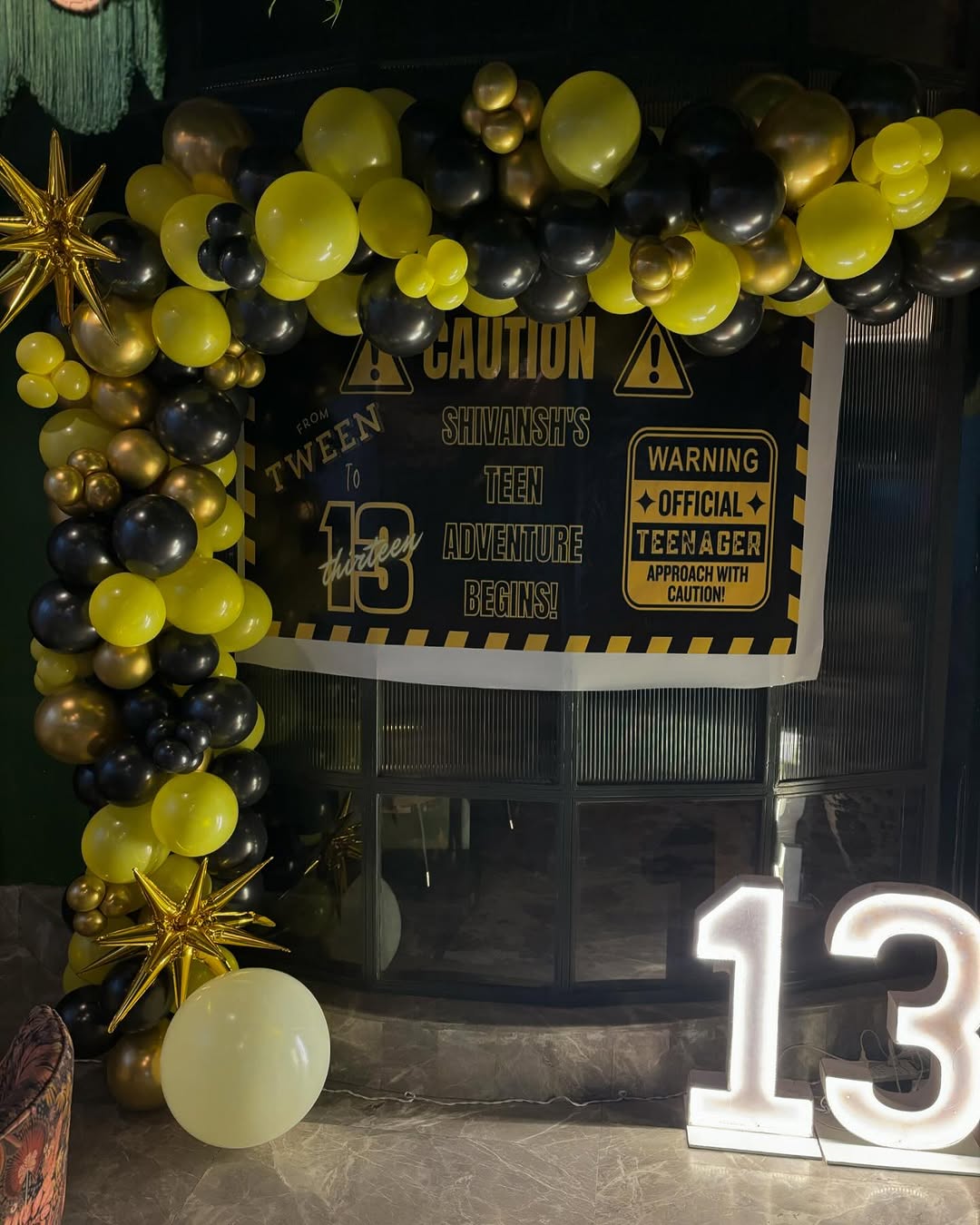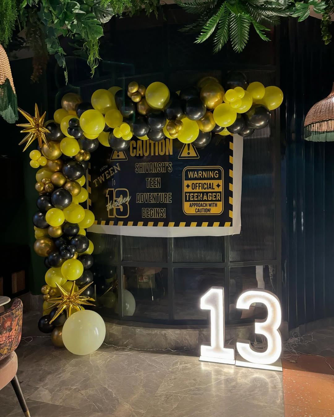 This bold and stylish 13th birthday decoration is designed with a caution and warning theme, symbolizing the exciting transition from childhood to teenage years. The setup includes a striking black and yellow balloon arch, a customized backdrop with caution signs, and large illuminated ‘13’ numbe...