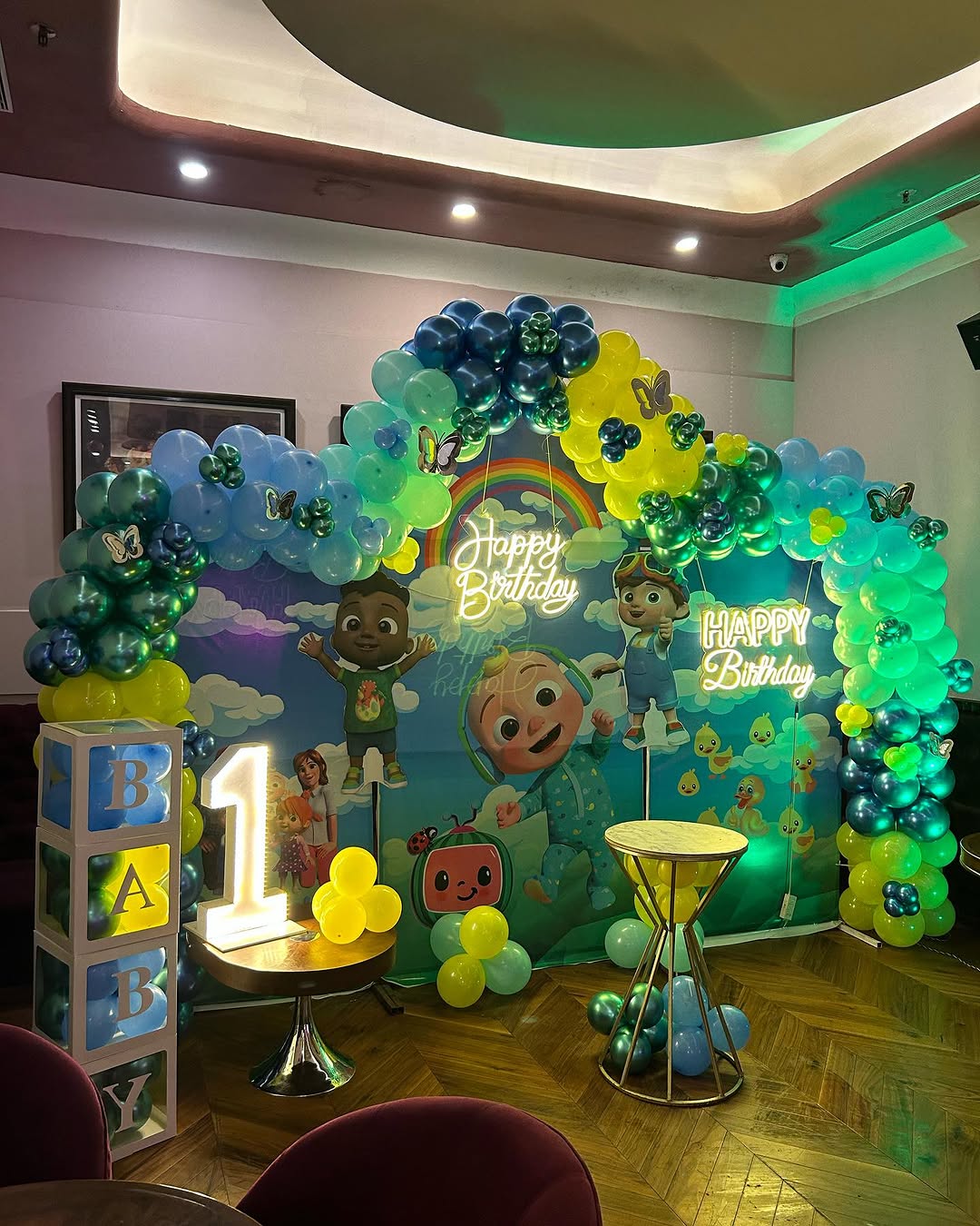 This Cocomelon-themed birthday stage setup is designed for 1st birthday celebrations and kids’ parties. The setup includes a customized balloon arch in blue, yellow, green, and metallic tones, surrounding a large printed Cocomelon backdrop with characters. The neon "Happy Birthday" sign adds a st...