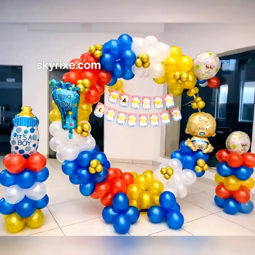 Make your celebration lively and joyful with this Colorful Baby Boy Naming Ceremony Decoration. Designed with a vibrant mix of blue, red, yellow, and white balloons, this setup creates a fun and energetic party vibe.